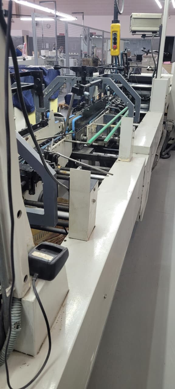 Observações : Fechadora / Coladeira de Cartuchos Marca ANTER modelo 55 Fabricação Espanhola Largura máxima 600 mm Largura Minima 75 mm Contador Eletronico Alimentação através de correia Velocidade 300 m/min Gramatura 500 – 500 g/m2 Dimensoes 7350 x 1005 mm Peso aproximado 2250 Kilos